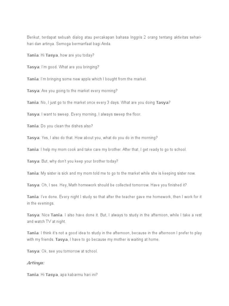Daily activity jika diterjemahkan kedalam Bahasa Indonesia berarti aktivitas sehari-hari. Apa itu daily activity. Percakapan sendiri merupakan rangkaian kata-kata yang diucapkan oleh satu orang kepada orang lainnya.